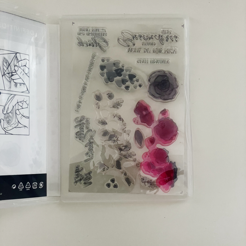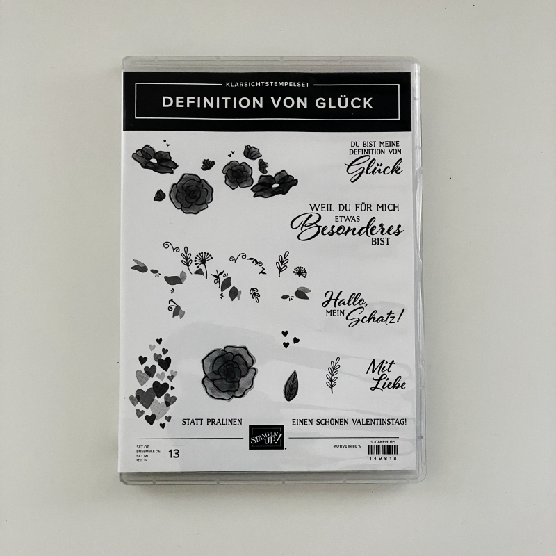 Das Stempelset Definition von Glück ist gebraucht und einige Stempel weisen Verfärbungen auf. Dies sind normale Gebrauchsspuren und kein Qualitätsmangel.