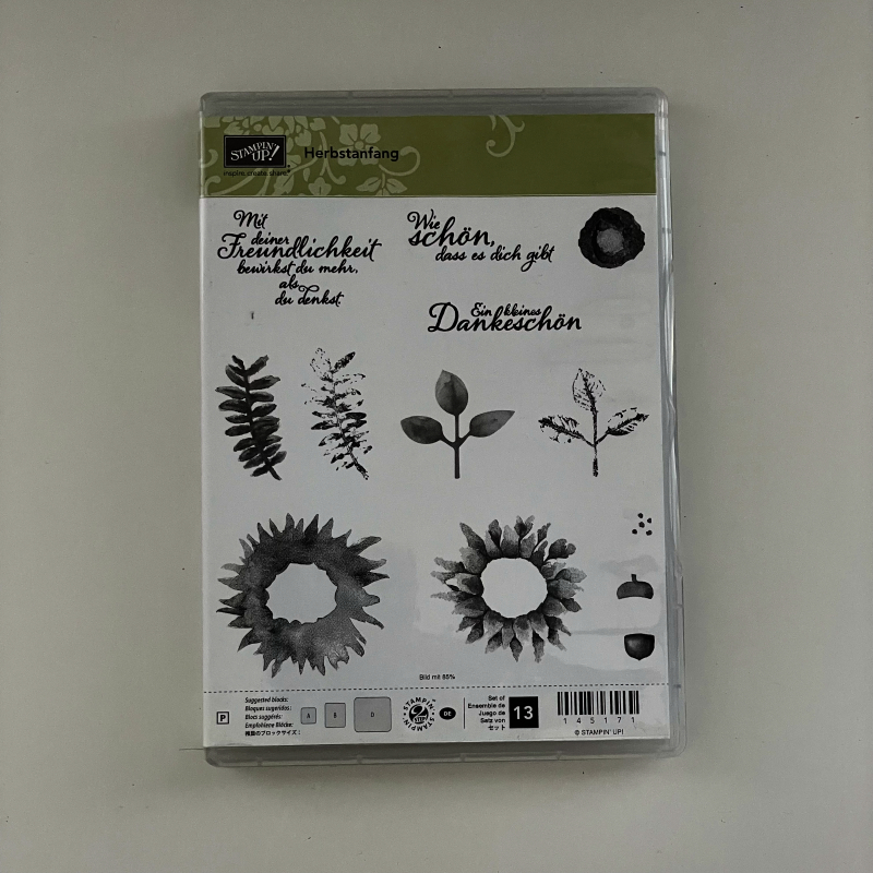 Das Stempelset Herbstanfang ist gebraucht. Zwei Stempel haben leichte Verfärbungen, was normale Gebrauchsspuren sind und kein Qualitätsmangel.